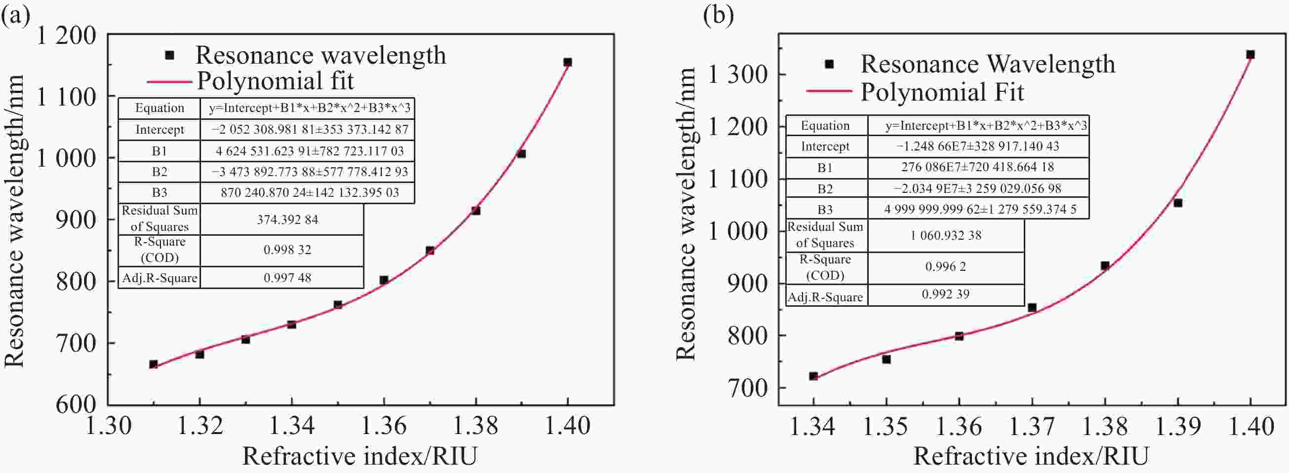 (RIU)1.31 X-polarization 1600 −192.57 6.25×10−5 Y polarization − − − 1.32 X-polarization 2400 −235.16 4.17×10−5 Y polarization − − − 1.33 X-polarization 2400 −291.80 4.17×10−5 Y polarization − − − 1.34 X-polarization 3200 −362.15 3.13×10−5 Y polarization 3200 −150.50 3.13×10−5 1.35 X-polarization 4000 −459.04 2.50×10−5 Y polarization 4400 −240.16 2.27×10−5 1.36 X-polarization 4800 −586.60 2.08×10−5 Y polarization 5600 −380.72 1.79×10−5 1.37 X-polarization 6400 −778.15 1.56×10−5 Y polarization 8000 −622.04 1.25×10−5 1.38 X-polarization 9200 − 1176.40 1.09×10−5 Y polarization 12000 − 1202.94 8.33×10−6 1.39 X-polarization 14800 − 1724.25 6.75×10−6 Y polarization 28400 − 1298.93 3.52×10−6 1.40 X-polarization − − − Y polarization − − − Table 2. Temperature sensing performance of single gold nanowire bias-core PCF-SPR sensors