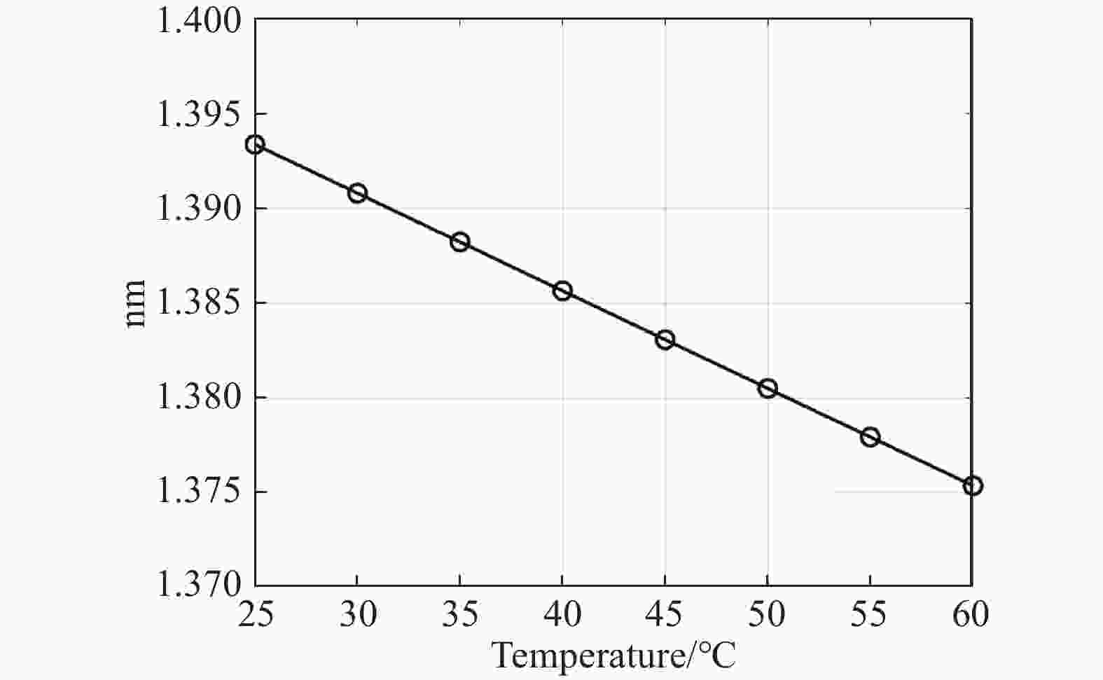 14800 nm/RIU和−1724.25 RIU−1,最高折射率分辨率为6.75×10−6 RIU;y偏振模式折射率检测范围达1.34~1.40,最大波长灵敏度与振幅灵敏度分别为28400 nm/RIU和−1298.93 RIU-1,最高折射率分辨率为3.52×10−6 RIU。在25~60 °C温度传感中,传感器表现出7.8 nm/°C的波长灵敏度与1.38×10−6 °C的高分辨率。该设计通过金纳米线与偏置芯结构的协同作用,在简化制备工艺的同时实现了多参数检测,为生化监测、环境传感等领域的集成化应用提供了新思路。Abstract:To address the challenges of complex metallic film coating processes and low integration in single-parameter detection for existing photonic crystal fiber surface plasmon resonance (PCF-SPR) sensors, a dual-parameter sensor based on gold nanowire-integrated bias-core PCF-SPR is proposed. Unlike conventional in-hole coatings or metallic film structures, the gold nanowires are directly attached to the fiber cladding via chemical vapor deposition (CVD), eliminating uneven coating issues and significantly simplifying fabrication. By optimizing the asymmetric bias-core fiber structure and leveraging the strong localized field enhancement of gold nanowires, the sensor achieves high-sensitivity synchronous detection of temperature (25−60 °C) and refractive index (1.31−1.40) in dual-polarization modes. The simulation results demonstrate that the x-polarization mode can achieve 1.31−1.40 refractive index detection with maximum wavelength sensitivity and amplitude sensitivity of