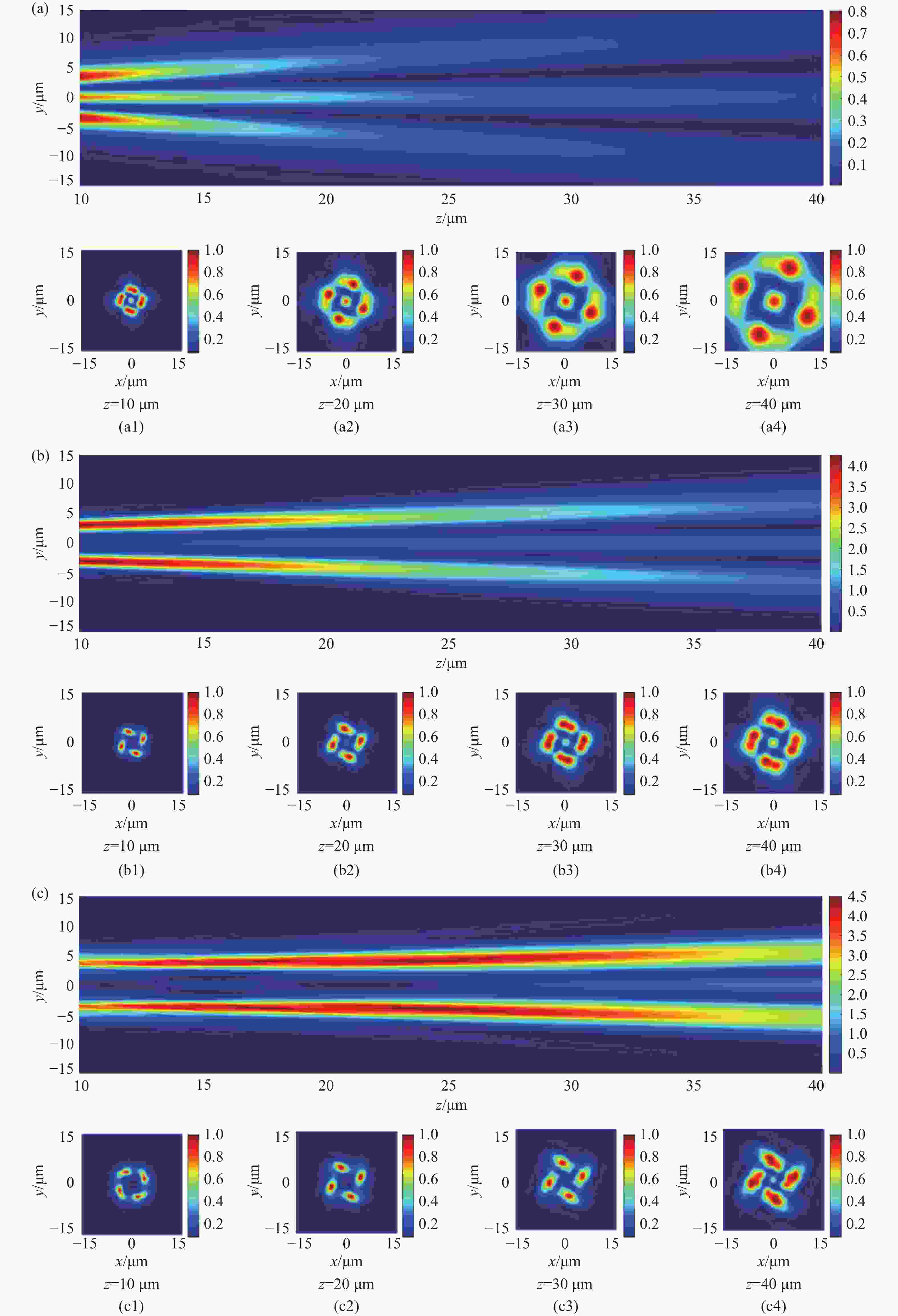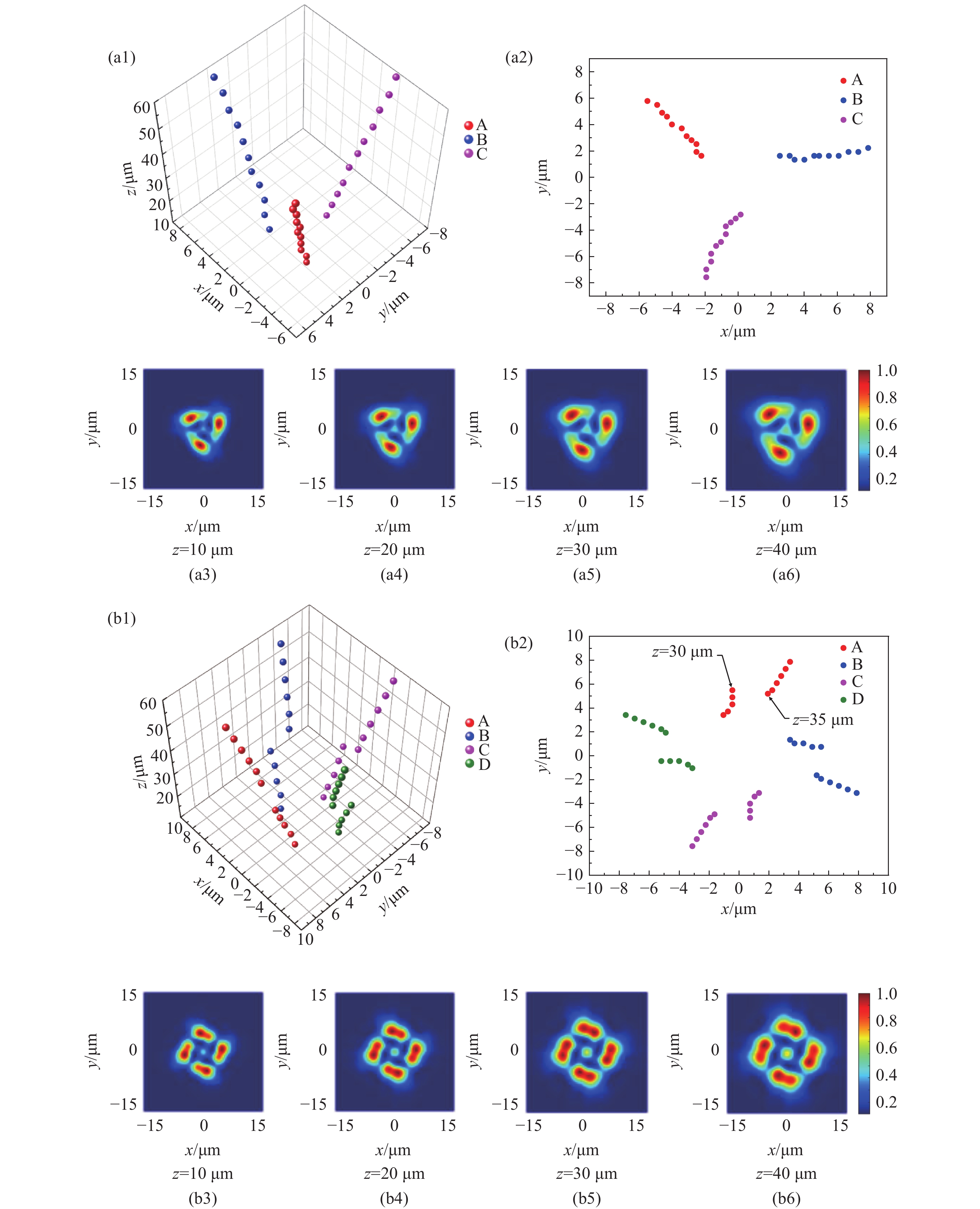 Figure 11.  The propagation trajectory diagram of peak point, (a1)−(a8) l=3, (b1)−(b8) l=4, where (a3)−(a8), (b3)−(b8) is the normalized intensity distribution at several fixed transmission distances, respectively.