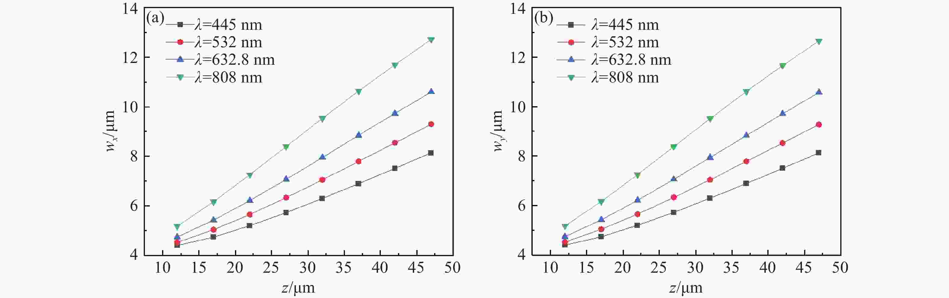 Figure 7.  The mean-squared beam width under different wavelengths (a) x-direction (b) y-direction.