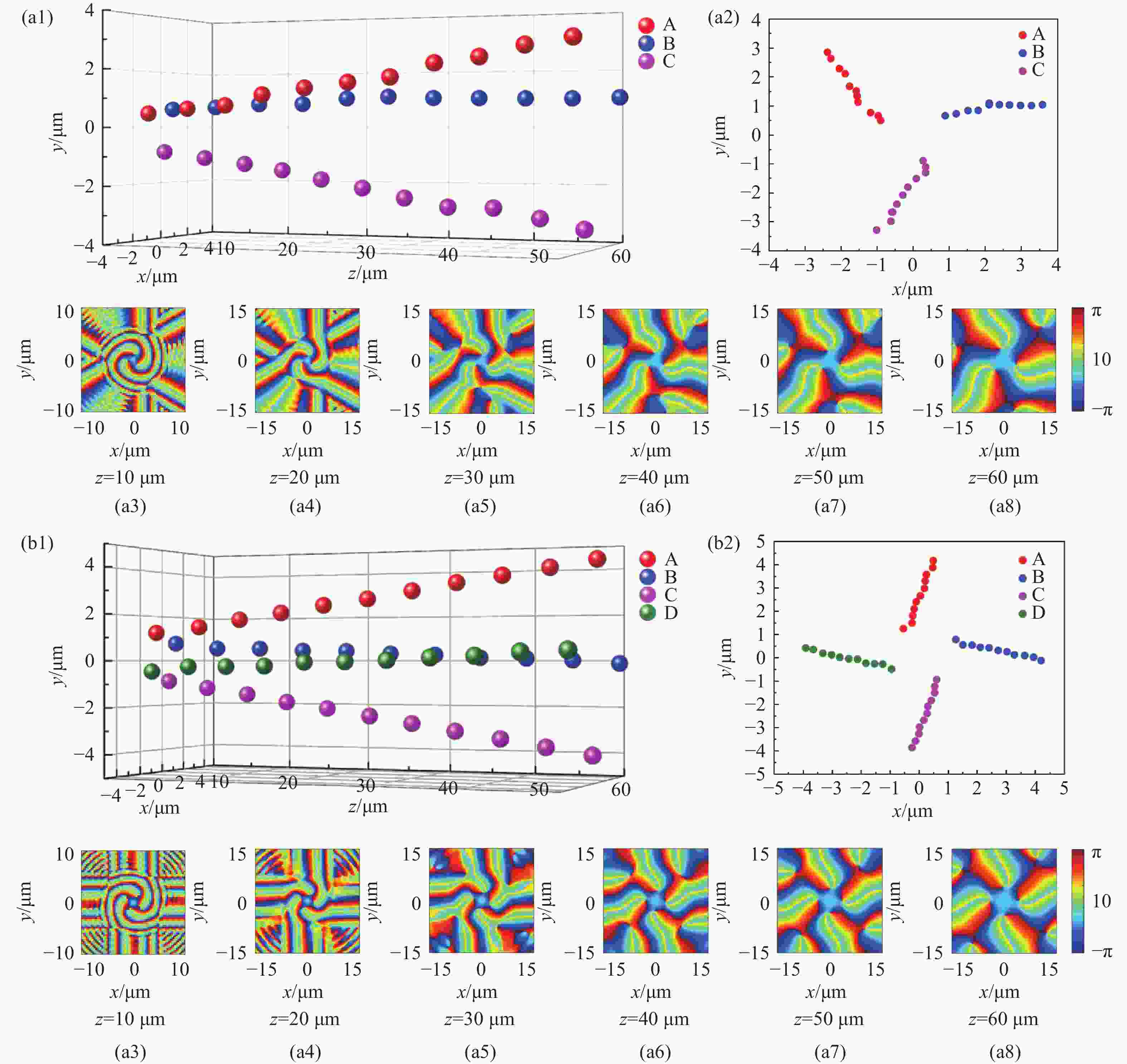 Figure 9.  The propagation trajectory diagram of coherent vortex positions, (a1)−(a8) l=3, (b1)−(b8) l=4, where (a3)−(a8), (b3)−(b8) is the phase distribution at several fixed transmission distances, respectively.