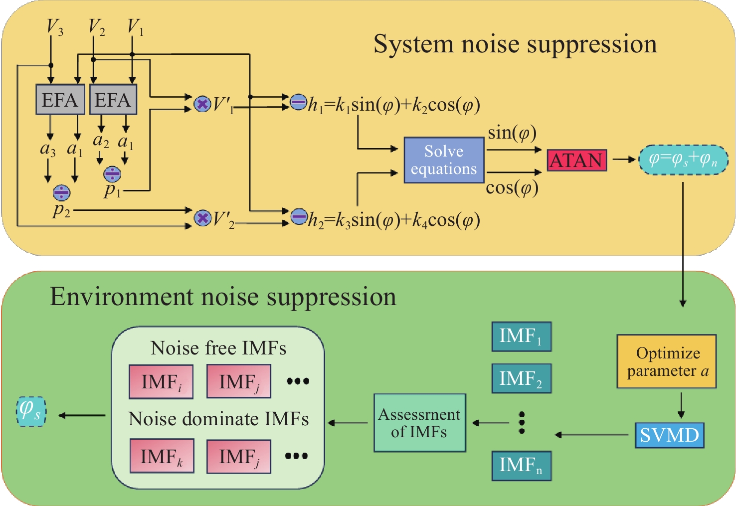 Noise interference critically impairs the stability and data accuracy of sensing systems. However, current suppression strategies fail to concurrently mitigate intrinsic system noise and extrinsic environmental noise. This study introduces a composite denoising approach to address this challenge. This method is based on the ameliorated ellipse fitting algorithm (AEFA) and adaptive successive variational mode decomposition (ASVMD). This algorithm employs AEFA to eliminate system noise tightly coupled with direct-current and alternating-current components in the interference signal, thereby obtaining a phase signal containing only environmental noise. The ASVMD technique adaptively extracts environmental noise components predominantly present in the phase signal. To achieve optimal decomposition results automatically, the permutation entropy criterion is employed to refine decomposition parameters. The correlation coefficient is utilized to differentiate effective components from noise components in the decomposition results. Experimental results indicate that the combined AEFA and ASVMD algorithm effectively suppresses both system and environmental noises. When applied to 50 Hz vibration signal processing, the proposed approach achieves a noise reduction of 17.81 dB and a phase resolution of 35.14 μrad/√Hz. Given the excellent performance of the noise suppression, the proposed approach holds great application potential in high-performance interferometric sensing systems.